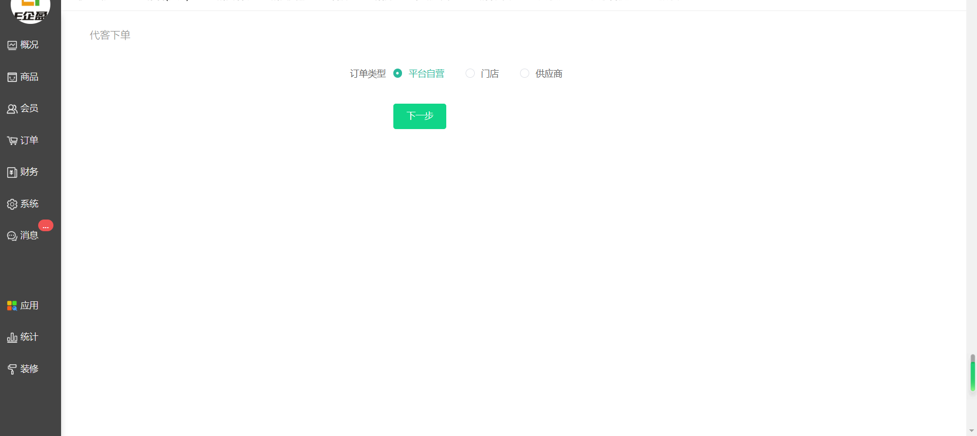 选择订单类型 勾选自营平台、门店、供应商(门店和供应商类型要选择到对应的门店或供应商),点击下一步选择该类型下的商品