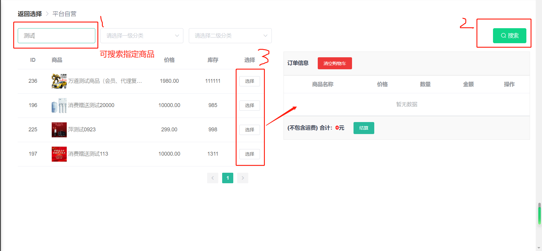 选择下单商品,支持搜索、分类筛选,支持选择多款商品;
